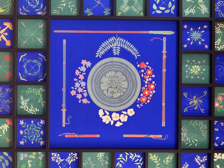 天井の中央にある杉板に描かれているのは、銅鏡や刀剣など古墳副葬品をイメージしたもの。色鮮やかな天井画を眺めていると、心が落ち着いていくようです。