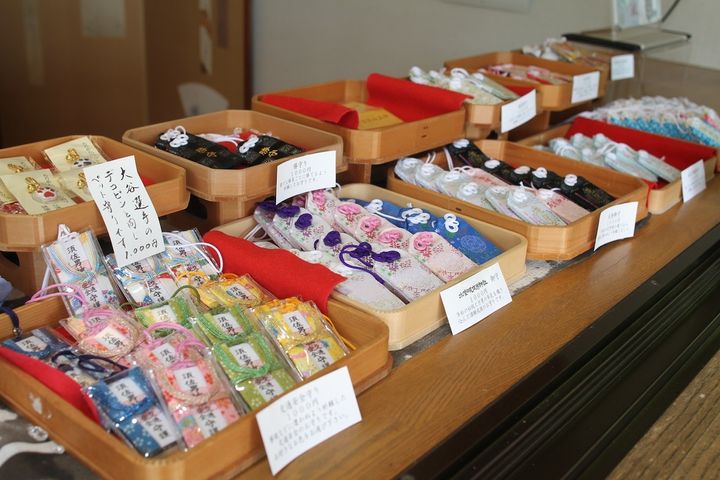 お守りもオシャレなデザインが多い「水堂須佐男神社」。厄除けや健康、合格祈願、学業成就、必勝祈願、交通安全など、さまざまなご利益をもたらすお守りが並んでいます。