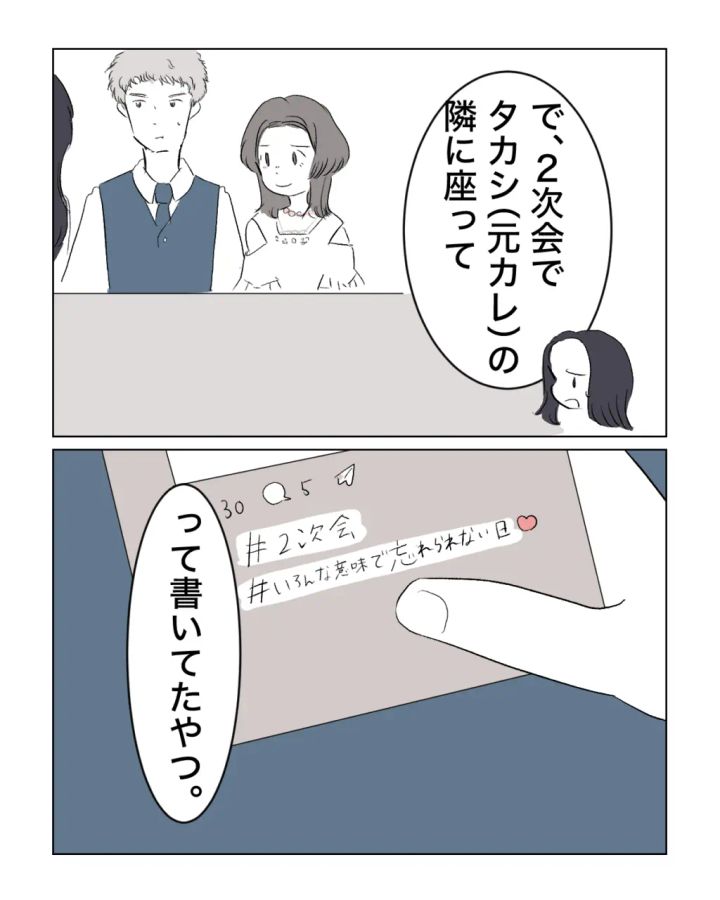 「で、二次会でタカシ(元カレ)の隣に座って『#いろんな意味で忘れられない日』って書いたやつ。」とルナさんが2次会で元カレの隣にわざわざ座り、その写真をSNSに投稿したことをアオイさんは思い出しました。