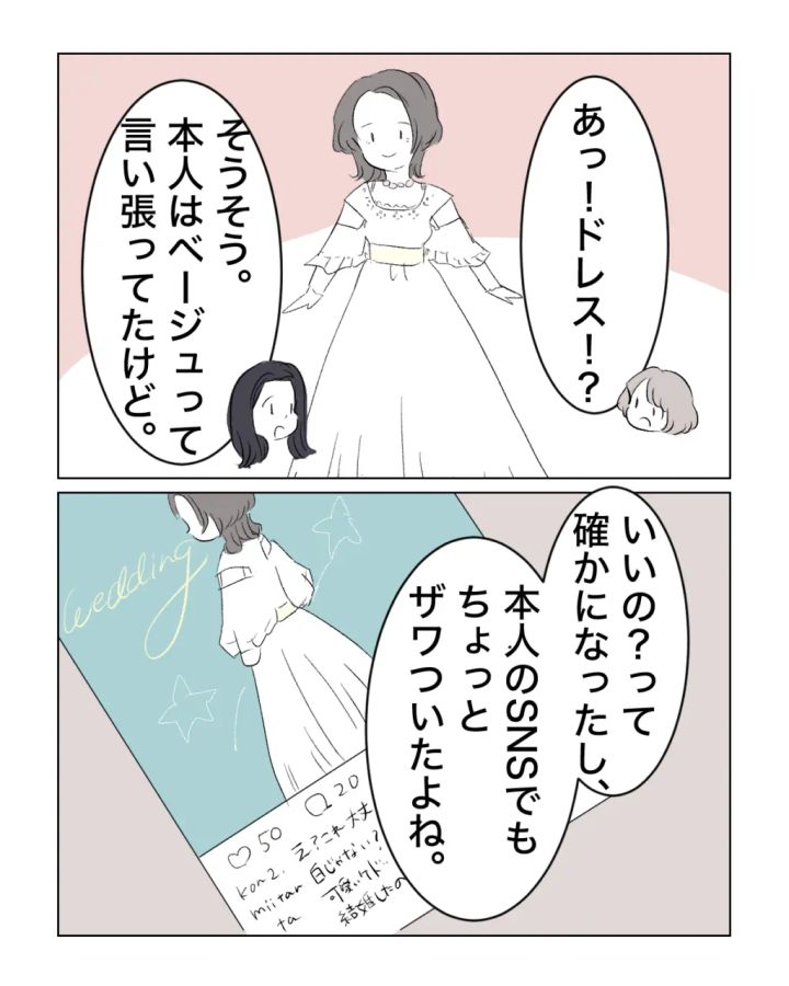 これはベージュ!友達の結婚式にほぼ白色のドレスを着てご満悦のギリギリを攻める女|ママ広場マンガ