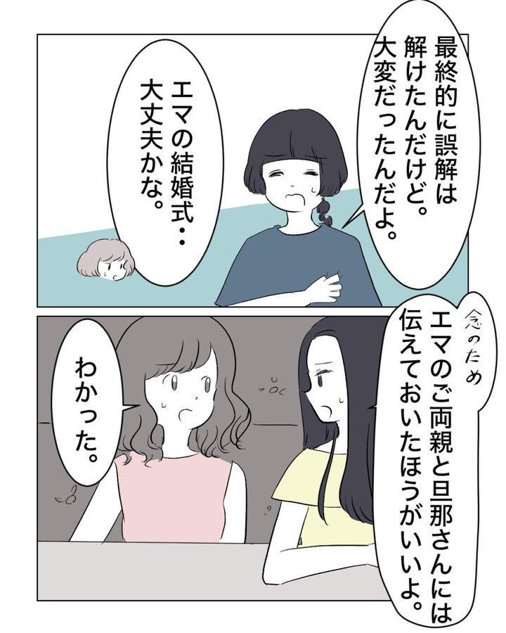 リオさんは「最終的に誤解は解けたんだけど。大変だったんだよ」と当時を思い出しました。ホノカさんはリオさんの話を聞いて「エマの結婚式・・・大丈夫かな。」と一気に心配に。アオイさんは「念のためエマのご両親と旦那さんには伝えておいたほうがいいよ」とエマさんに伝え、エマさんも「わかった。」と頷くのでした。