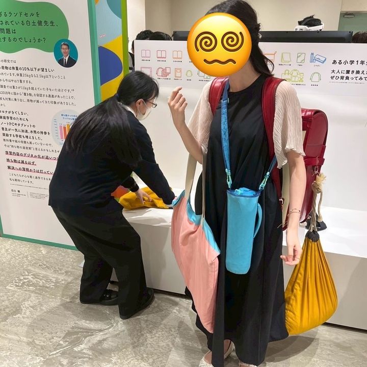 大人サイズに換算した、通学セットを実際に持って体験できるコーナーもありました!