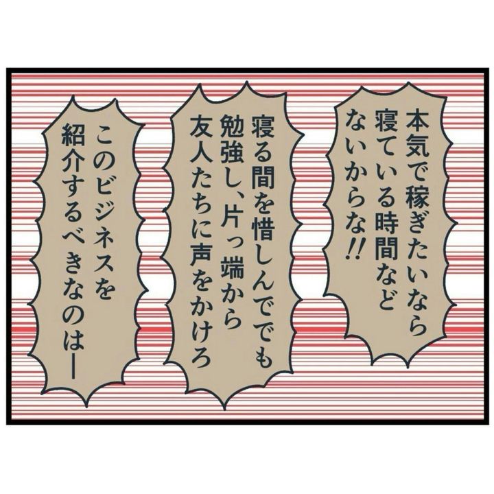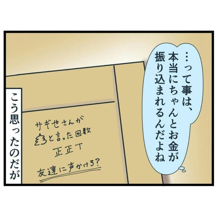 サギ也の説明は所々不審な点もありましたが、「あずきの紹介だから大丈夫」と思ったナエくまさんは言われた通り、バイトに登録し、登録料の30万円を振り込みます。すると登録した後日、説明の日に知り合ったあんこから「バイトの説明会に出席して」と依頼がありました。気乗りはしませんでしたが、仕事だから…と説明会に出席したナエくまさんでしたが…。