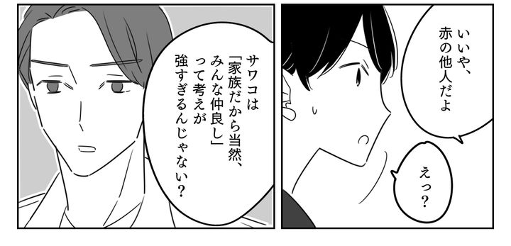 夫からの「赤の他人」という言葉が出て、驚きました。さらに夫は「サワコの家は『家族だから、当然みんな仲良し』って考えが強すぎるんじゃない?」と、核心をついてきました。