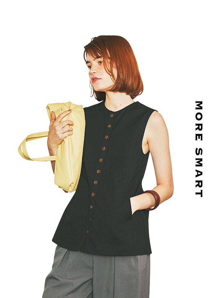 シャツでもない、ジャケットでもない。コンパクトな黒ベストは、前ボタンをアクセントにして、軽やかさときちんと感のバランスを調整。首元を詰めたクルーネックが、ほんのりマニッシュな印象を与えながらも、ノースリーブの抜け感で軽快に。