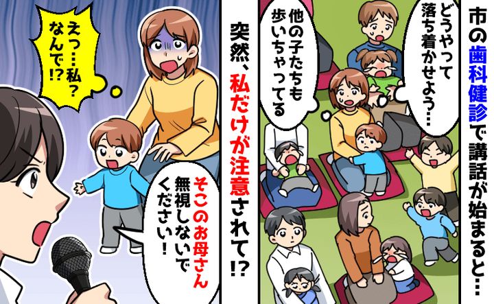 双子の息子と娘が2歳半になる月、市の歯科健診に行きました。そこで保護者向けの歯科衛生士さんの講話があったのですが、2歳児がじっと聞き続けられる内容ではなく……そのとき、事件が起きました。