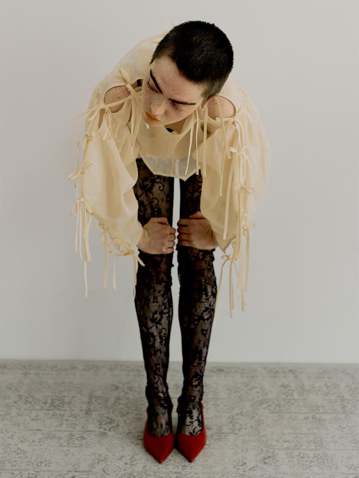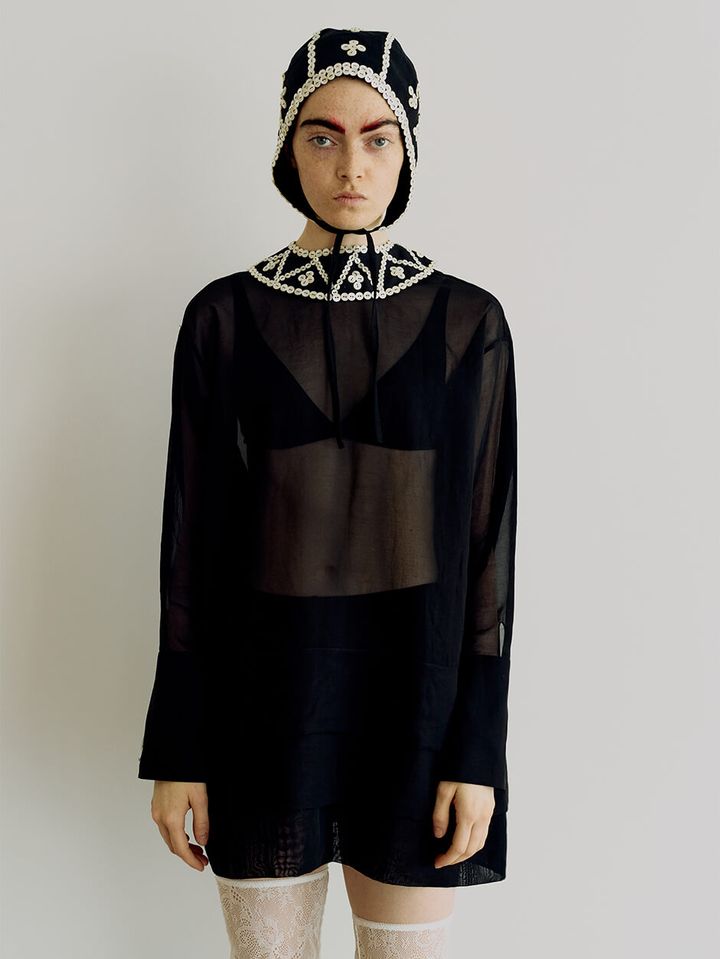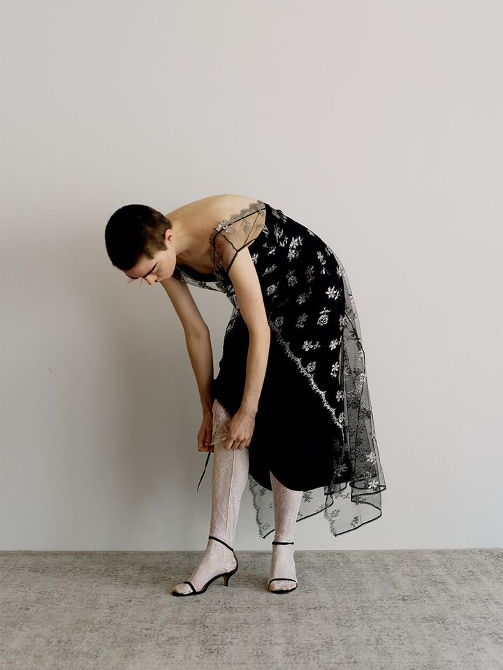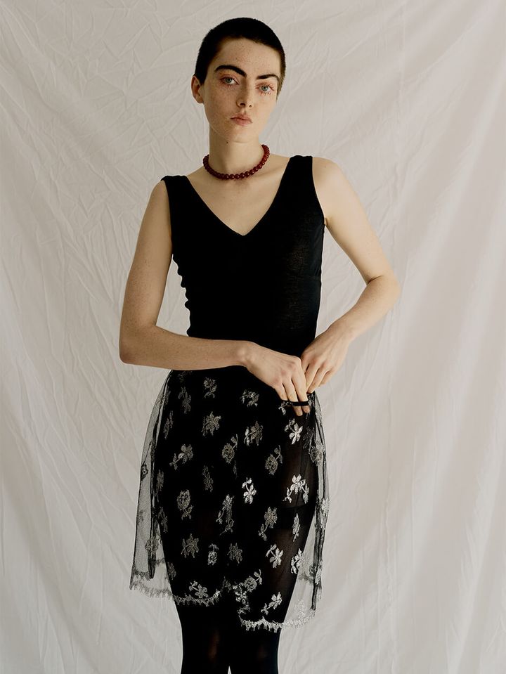 デザイナーの記憶に刻まれた記憶の断片や胸の奥に静かに宿る感覚を手がかりに、時間が経過しても変わらずに息づく温もりを、手仕事の細やかな跡や繊細なレースの重なりで表現。
