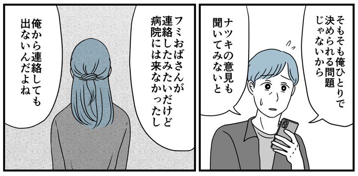 優しいアツシは、きっと同居して義母をサポートしてあげたいと思ったことでしょう。けれど私としてはそれを承諾することはできません。アツシもその理由に理解を示してくれて、やはりアツシは心の優しい人だと安心しました。一方でナツキさんは、母親の入院という大変な事態になっているにも関わらず、あまりにそっけない態度だったのでした。