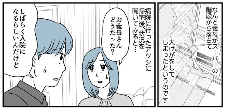 妊娠7か月を迎えたある日、義実家の近所で暮らすフミおばさんから思いがけない連絡が入りました。スーパーの階段で足を踏み外して転げ落ちてしまった義母は、そのまま入院になってしまったのです。しかも打ちどころが悪かったそうで……。