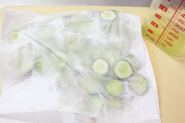 きゅうりから出た水分を計ってみると、約50mlも!輪切りきゅうりはキッチンペーパーに挟み、しっかりと水気を拭き取っておきました。