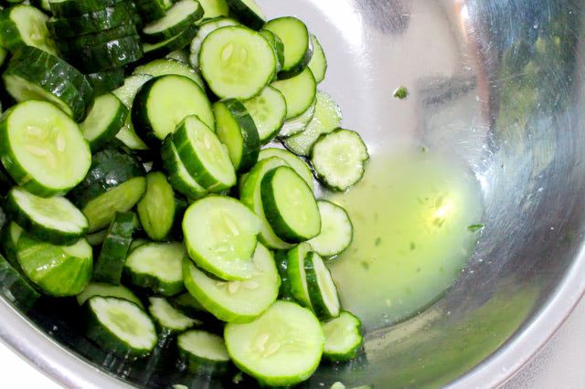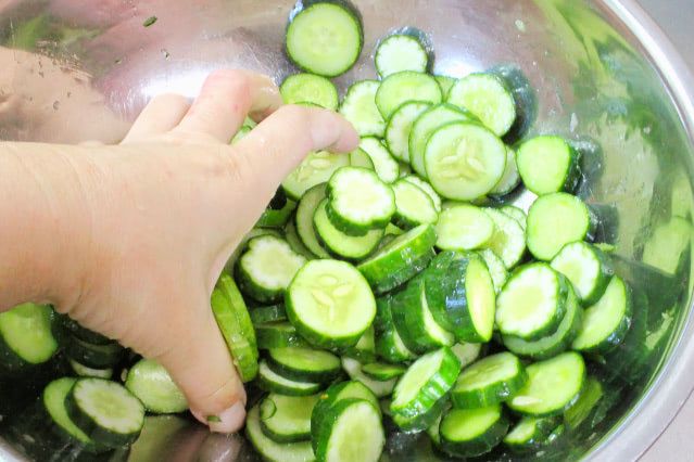 輪切りにしたきゅうりは、汗をかいたようになるまで、塩と砂糖をしっかりと揉み込みます。1時間ほどおくのが理想ですが、急いでいる場合は、短時間でも構わないとのこと。