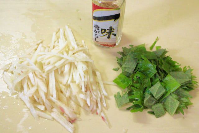 2. 新しょうがをきれいに洗って、皮付きのまま千切りにします。青じそは粗みじん切り、鷹の爪は種を取り除いて細かく刻みます。