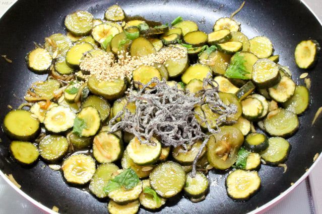 5. 煮汁が少なくなったら青じそを加え、サッと火を通します。火を止めてから、塩昆布とゴマを加えて混ぜ合わせます。