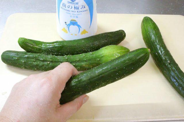 笠原さんは板ずりではなく、塩を付けた手できゅうりをこする、塩ずりをしていました。これだと、きゅうり全体を手でこすれるので、トゲトゲが取れやすそう。