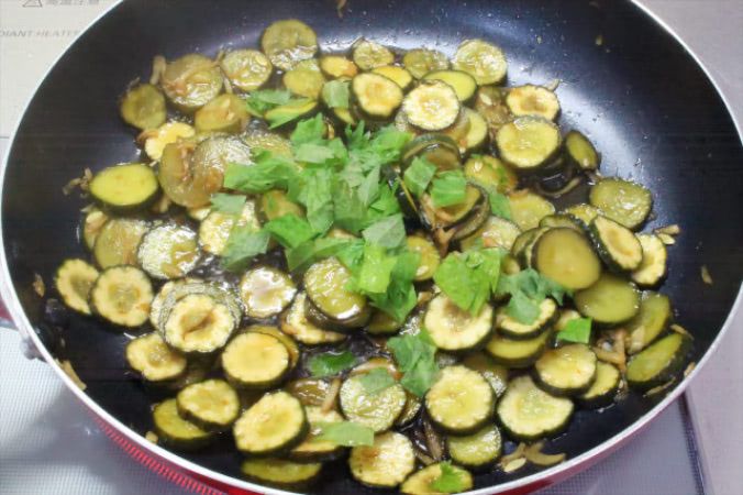 煮汁がほとんどなくなったところで、青じそを投入。サッと混ぜて火を止めました。