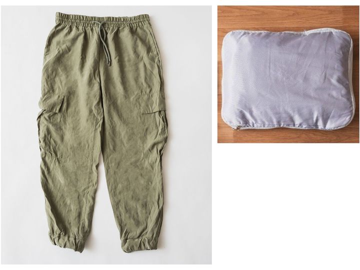 表面と裏面にそれぞれしまえる衣類圧縮ケースが大活躍。「きれいな服と汚れた服を別にしたいので、片側に新しい服を入れ、反対側に着用ずみの服を入れて持ち帰るようにしています」。
