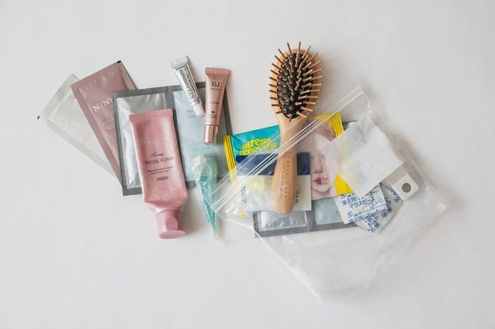 「洗顔用品やコスメもできるだけ軽量化したいので、試供品が大活躍。洗顔フォームは、この旅で使いきるつもりで、中身がほぼ入っていないものを持参。意外となくならず、持って帰ってくることも多いんですけどね(笑)」