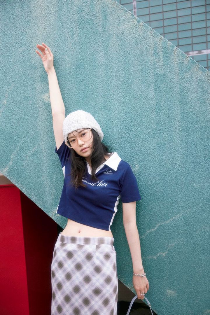 襟付きのユニフォームTは短丈&コンパクトなサイズ感が旬。チェックのタイトスカートとクリアオレンジメガネで甘辛MIXコーデに。