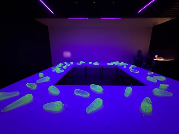 マリィ・クラーク《私を見つけましたね:目に見えないものが見える時》は、パラフィンワックスに封じ込めた葦を染め、アセテート紙に印刷し、それを無数に並べることで、記憶や文化の層を可視化するインスタレーションです。アボリジナル文化において装飾や実用の両面で用いられてきた葦は、失われゆく伝承や見えない歴史を象徴し、観る者に静かに語りかけます。