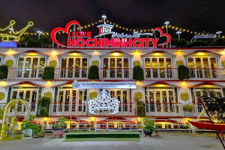 ホーチミン初日の夜を締めくくるのは、市内を流れるサイゴン川で船に揺られながら楽しむディナークルーズ。乗船するのはギラギラの船体が眩しい「インドシナ・クイーン号」。この船で約3時間のクルーズに漕ぎ出します。