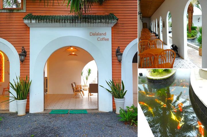 地区内にはおしゃれなカフェも点在しており、なかでもいま若者を中心に人気なのがこちらの「Dalaland Coffee」。地中海リゾートのような白いアーチ、鯉が悠々と泳ぐ大きな池がある中庭がフォトジェニックなポイントです。