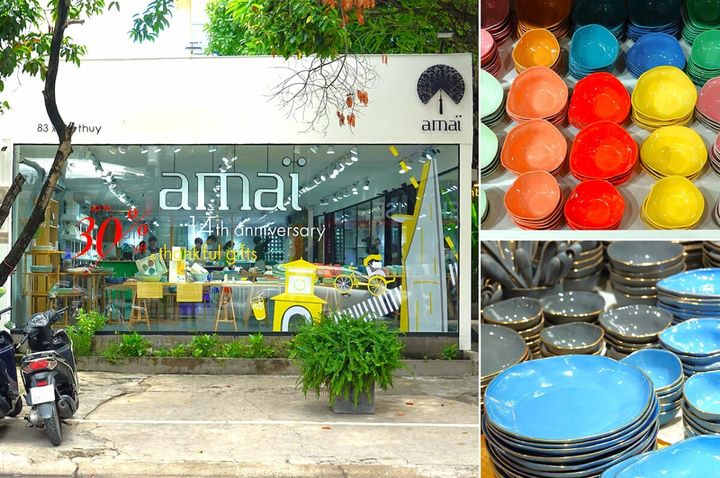まず訪れたのが高級テーブルブランド「amai」の直営店。ベルギー人とベトナム人のデザイナーによって立ち上げられたブランドで、波打ったような独特の形状と鮮烈なカラーリングの食器が看板商品。