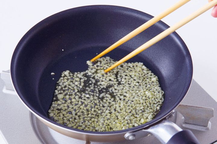 にんにくが色づいたら火を止め、オイルに塩、こしょうを混ぜてからサーモンにかけます。火を止めてからひと呼吸おくことで、サーモンに火が入らず、色が変わる心配もありません。