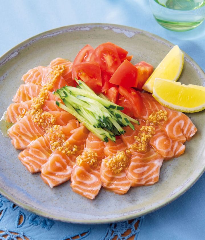 サーモンと夏野菜をたっぷり合わせて、あとはレモンをぎゅっと絞るだけ。涼やかで華やか。ごちそう感もしっかりあるカルパッチョです。