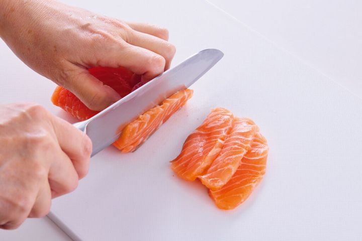 (1)きゅうりは斜め薄切りにしてからせん切りにする。トマトはへたを取り、縦4等分に切ってから斜めに2~3等分に切る。レモンは縦半分に切る。にんにくはみじん切りにする。サーモンは横に幅7~8mmに切って器に広げながら盛り、きゅうり、トマト、レモンを添える。