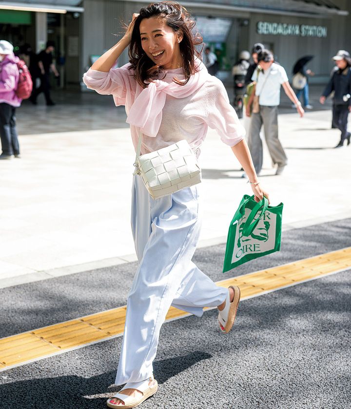 パンツ¥16,940(シップス/シップス インフォメーションセンター)ニット¥7,990カーディガン¥8,990トートバッグ¥3,990(すべてアンフィーロ)タンクトップ¥18,700(アールビーエス/レイ ビームス 原宿)ショルダーバッグ¥64,900(イアクッチ/イアクッチ 大丸東京店)サンダル¥74,800(パロマ バルセロ/アマン)ピアス¥159,500〈ウノアエレ〉ブレスレット¥22,000〈ウノアエレシルバーコレクション〉リング¥9,900〈ワンエーアールバイウノアエレ〉(すべてウノアエレ ジャパン)