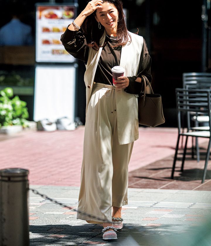ジレ¥9,900パンツ¥6,600(ともにエルーラ/アダストリア)カットソー¥26,400(ベースレンジ/アダム エ ロペ)バッグ¥231,000(ボナベンチュラ/ボナベンチュラ カスタマーサポート)サンダル¥14,740(シー ユナイテッドアローズ/ユナイテッドアローズ カスタマーサービスデスク)ピアス¥22,000(バルブス/ZUTTOHOLIC)ネックレス¥71,500(ウノアエレシルバーコレクション/ウノアエレ ジャパン)リング¥12,650(ココシュニック オンキッチュ/ココシュニック)