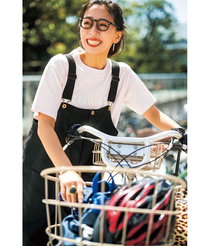 Tシャツ¥4,990(アンフィーロ)オーバーオール¥18,700(ユニバーサル オーバーオール/カレンソロジー 二子玉川)バッグ¥23,100(オルセット/オルサ)メガネ¥46,200(アイヴァン/アイヴァン 東京ギャラリー)ピアス¥121,000(ウノアエレ/ウノアエレ ジャパン)ブレスレット¥7,560(アビステ)リング¥40,480(ピニャッタ/ZUTTOHOLIC)