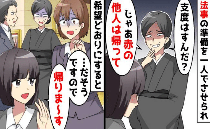 招待客が全員そろい、いよいよ読経が始まるというとき。義母は私に、「じゃあ、赤の他人は帰って」と言ったのです。