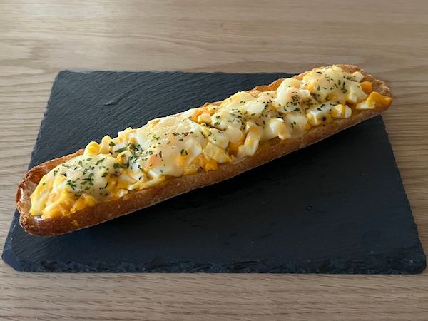 「タルティーヌ(卵)」(250円・税込) 敢えて黒糖入りではないパンもチョイスしてみました。パン生地に地養卵を使った特製サラダがたっぷりのっています。チーズもかかっているのでピザ感覚で食べられて、ボリュームも大満足でした。