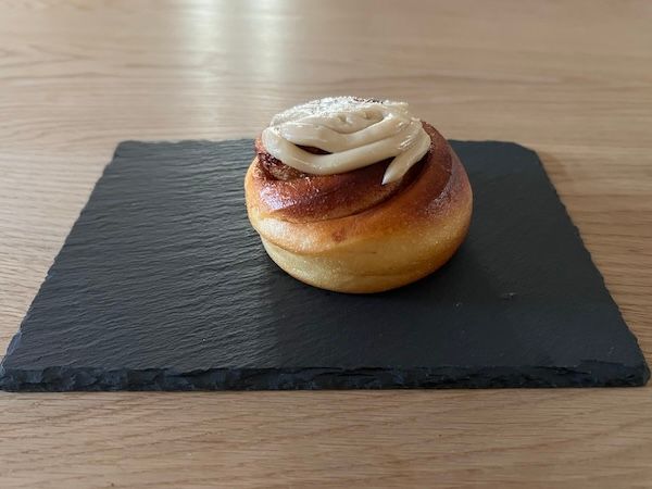 「黒糖シナモンロール」(210円・税込) 沖縄波照島黒糖を使用。シナモンのスパイシーな中に和風の風味が感じられます。注目なのはトッピングのチーズクリーム。コクのあるやさしい甘さ!チーズの風味もしっかりと感じられ、通常のフロスティングとは全く異なるものでした。