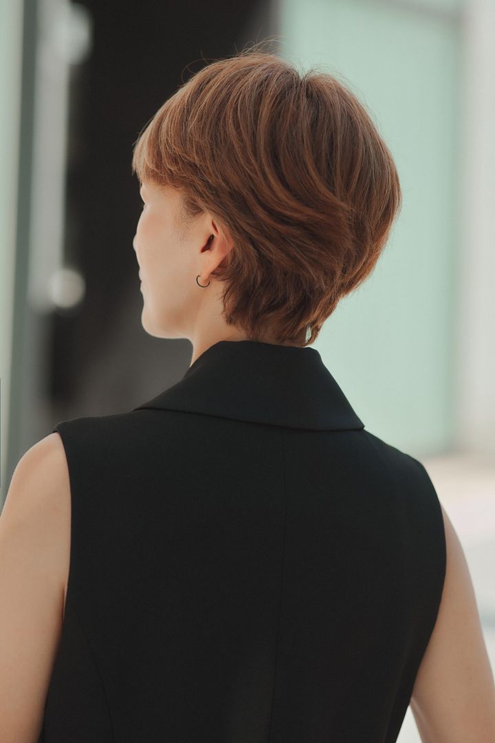 50代になったらショートにしようって思っていました。加齢とともに髪質が変わり、ミドル・ロングヘアでいることが難しくなってきたとき、なにも髪の長さに頼っていなくてもイイなって。自分の変化を受け入れて、それはそれ、拘り過ぎて変わった髪質に立ち向かうより、他のことに時間を費やそうって思ったんです。ショートヘアってイイですよ! まず、小顔に見える、清潔感がある、日々のお手入れが楽! それになんていっても、明るく活発にみられるし、仕事ができる人に見えるみたい(笑)。うねりを利用して、毛先に動きを出してもらっているので、ドライヤーで乾かすだけで簡単に仕上がるようになっています。