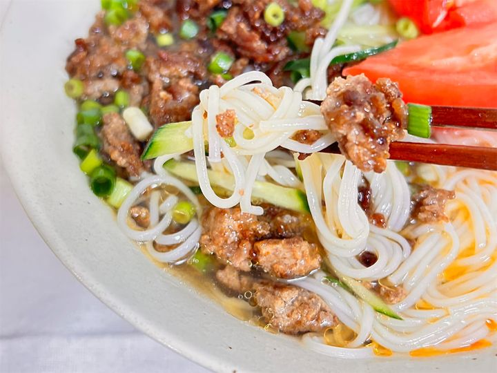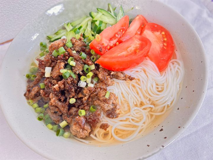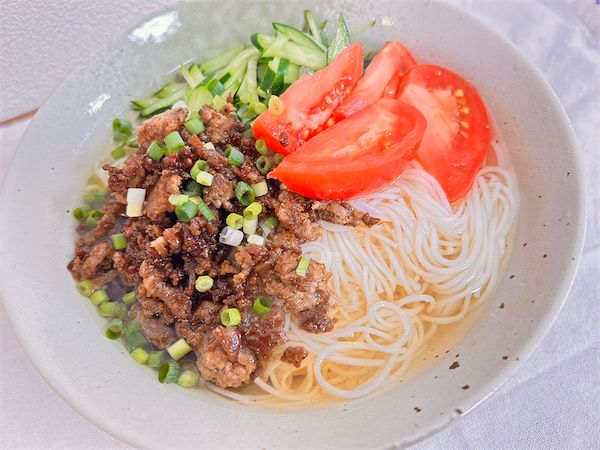 5.4のそうめんを丼に移し、1の肉みそと3のきゅうり、トマト、青ねぎをトッピング。