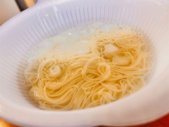 茹で上がったそうめんは、氷水にとって冷やしておきます。