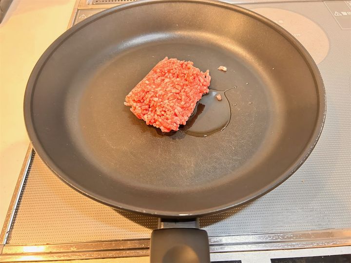 フライパンに油を引き、ひき肉を中火で炒めていきます。
