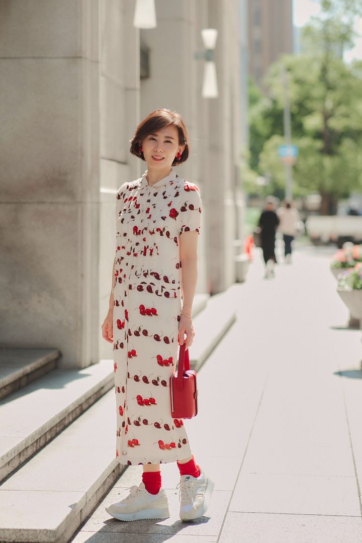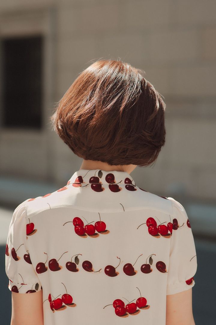 顎ラインのショートボブは、意外にも、女らしいワンピースも着こなせます。