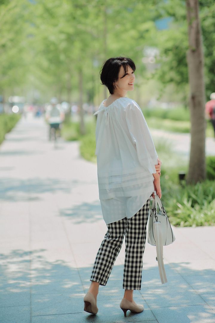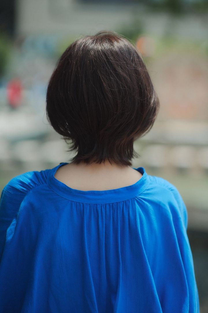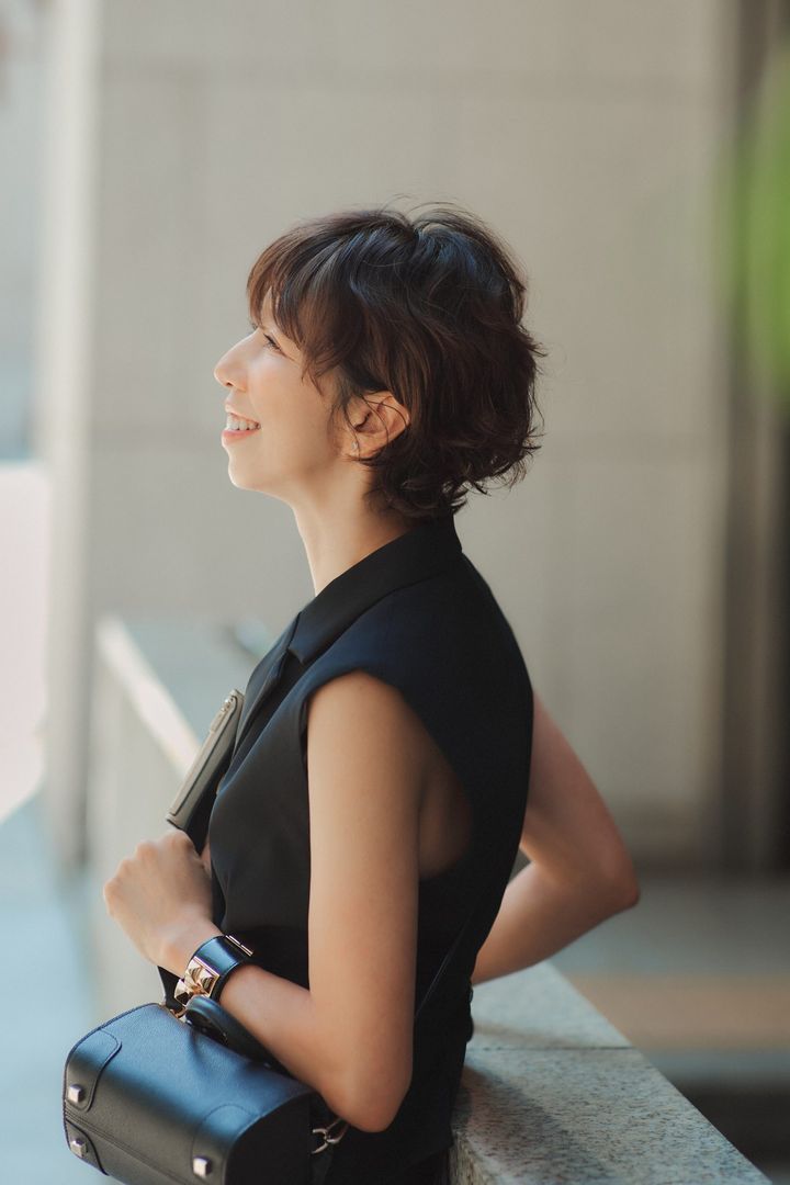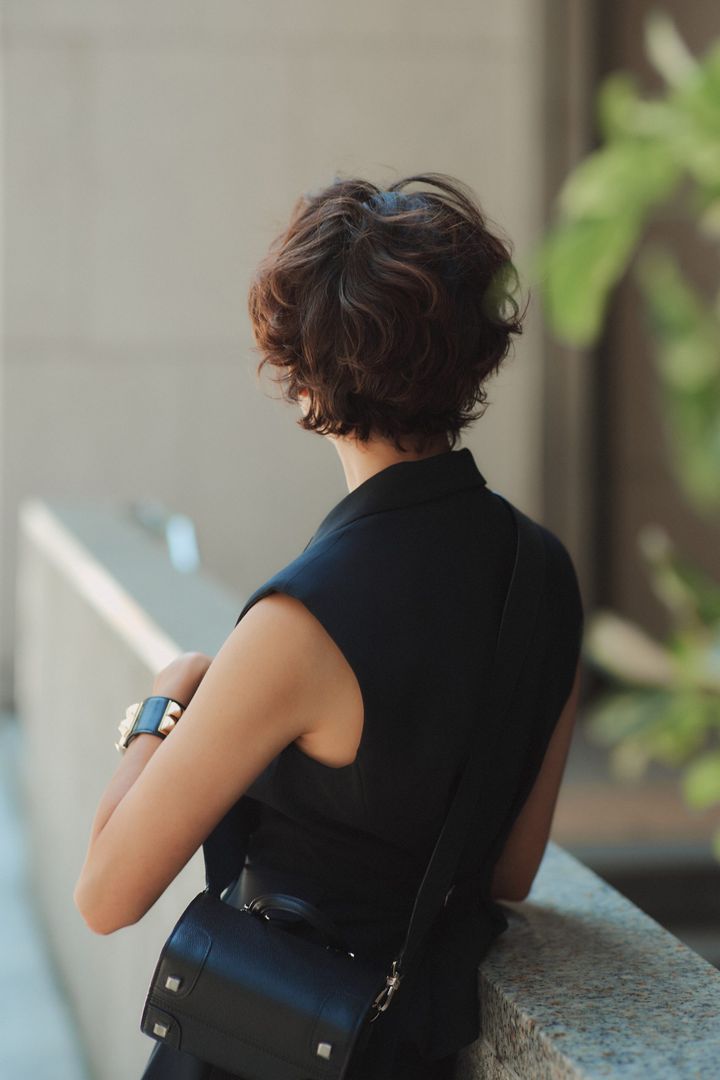 ショートにしたのは結婚後、30歳を過ぎた頃。伸ばすと癖が出てきてストレートにならず、うねりがランダムに出てしまう髪質。ブローにも時間がかかるので、思い切ってショートにするとイイことづくし。癖が出にくく、ブローなどの時間が短縮されて、髪のお手入れに時間が取れるので、艶も潤いもでてきたんです。長い髪の毛に女性らしさを感じていましたが、ショートの方が毛先で優しいニュアンスがつくれて優しい表情に。最近は後頭部がふんわりするように、パーマをかけたり、シルエットを楽しんでいます。