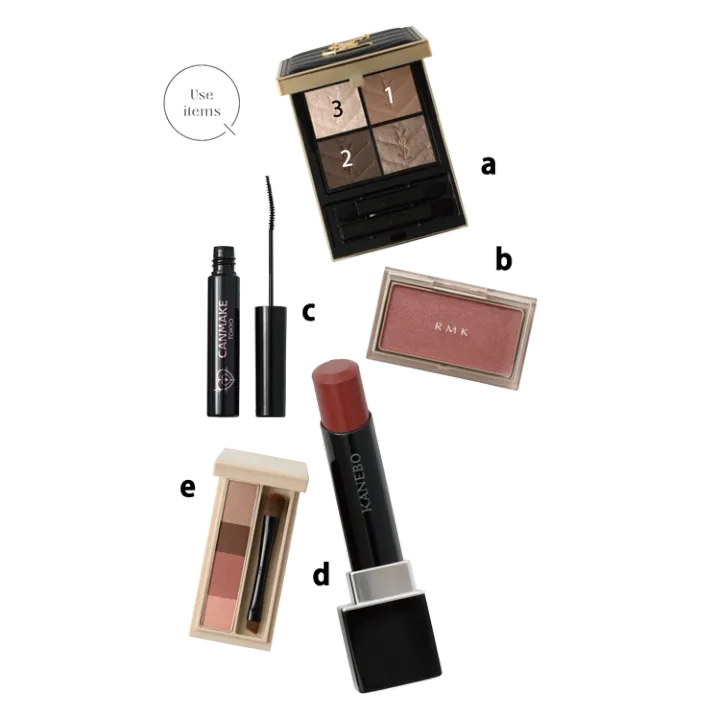 ▶︎眉には、下2色の明るい色でほんのりピンクのニュアンスをつけてハズシを。
