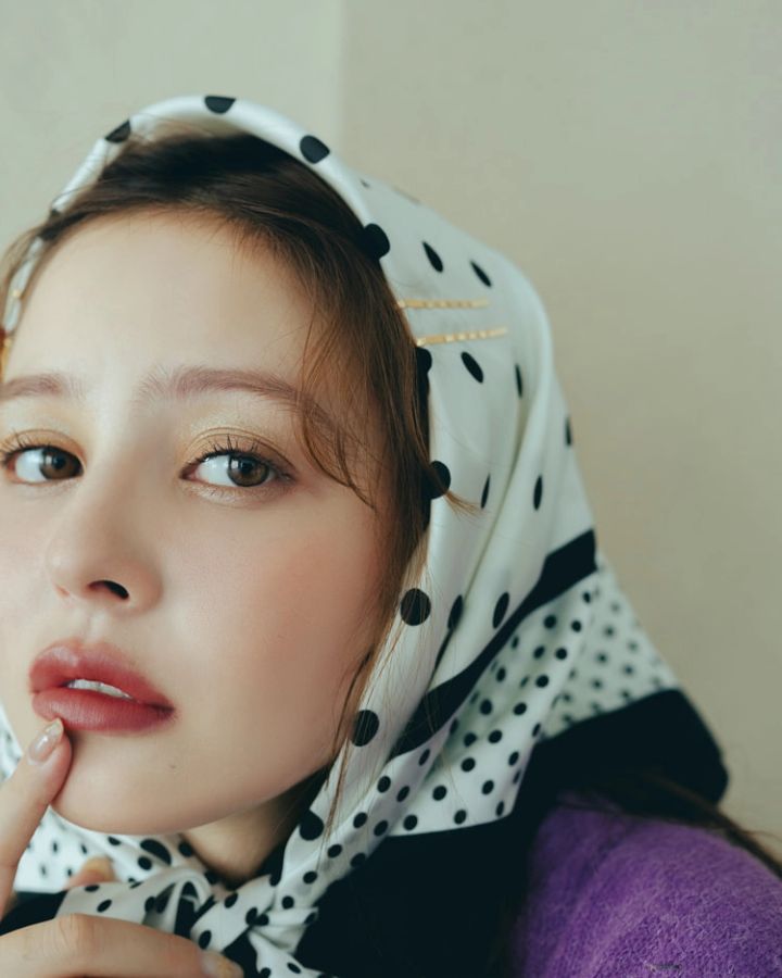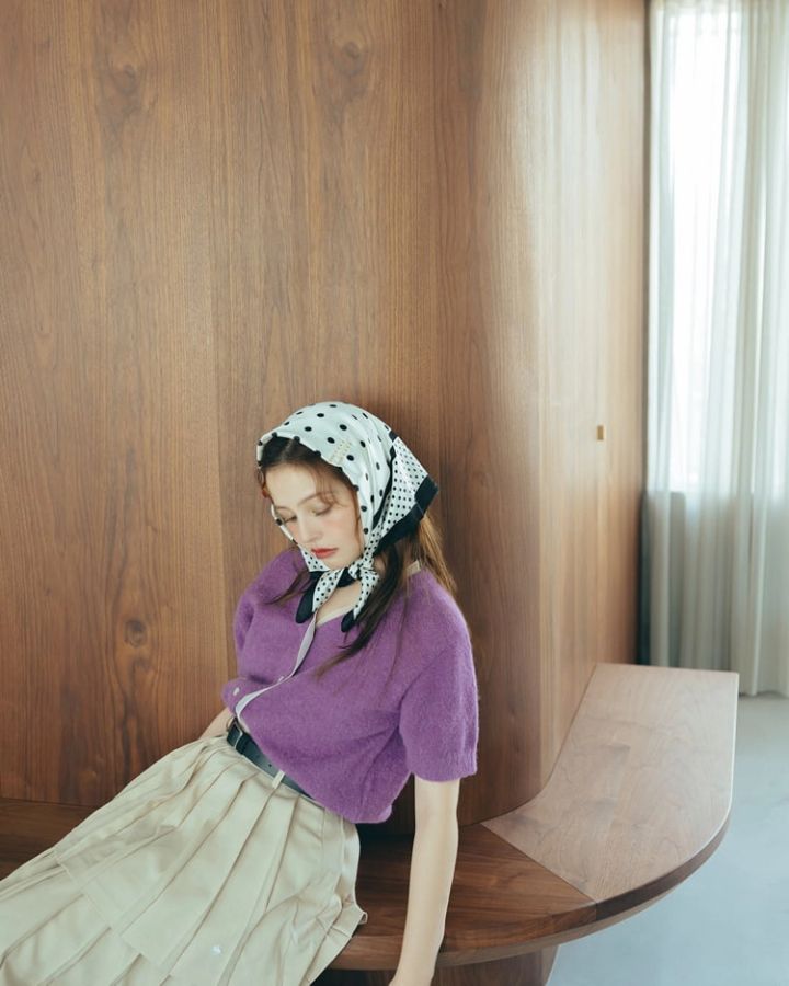 顔まわりをヘアアイロンで軽く巻いてニュアンスつけたら、その毛束を残して全体にスカーフを巻く。ヘアピンで固定するとズレにくいうえ、ワンポイントにもなるよ。