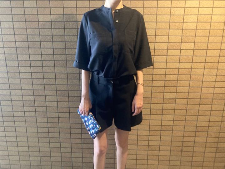 ブラウスはクロス ファンクションの「サマナチュラ リネンライクバンドカラーハーフスリーブブラウス」で¥3,960で購入。その他も筆者私物