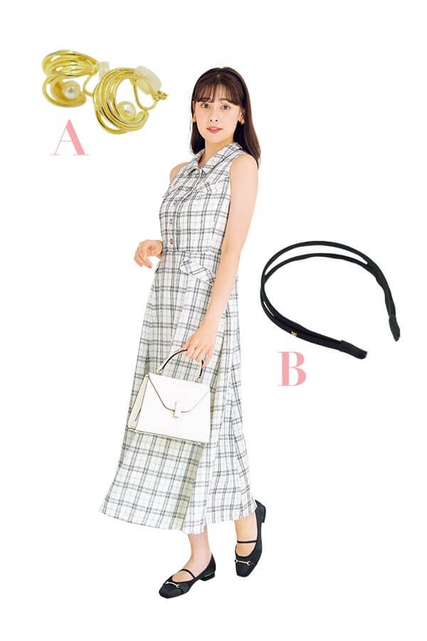 「きれいめにもカジュアルにも着回せて万能なシャツワンピ♡ 今回は、カチューシャやパールイヤリングなどのアクセサリーで上品さをプラスして、華やかなディナー向けにしてみました。ワンピはほんのりアメスリになっていて、抜け感が出せるのがポイント。重く見えがちなツイード生地も、夏らしく軽やかに着こなせます♪」