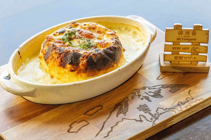 谷川岳をモチーフにしたボリュームたっぷりの「谷川岳パングラタン」1,400円(税込)。オーダーごとに器ごと焼き上げて、熱々グツグツの状態で提供 出典: 美人百花.com