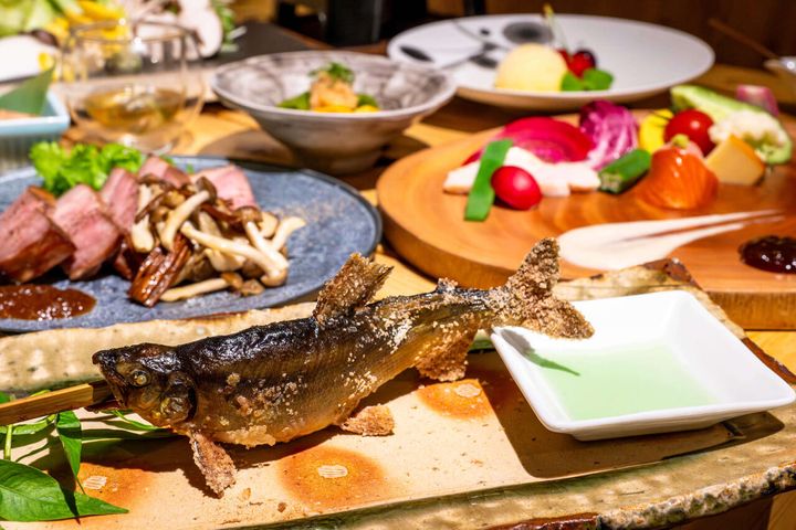 地元の方言で「たくさん召し上がれ」を意味する「お山の食堂 たんとくわっさい」では、ハンターでもあるシェフ自らが山や川で食材を採取。伝統的な郷土料理にアレンジを加えたオリジナリティあふれるジビエ料理を提供します。