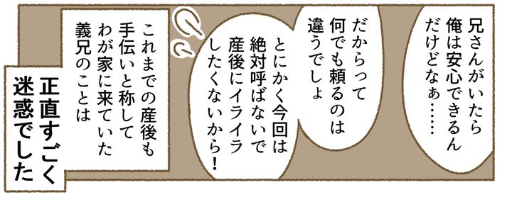 私の願いを本当に理解しているのか不安でした。里帰り出産後、家に帰ると……笑顔の義兄が。夫に問いただすと、「人手は多い方がいい」と反省する様子すらありません。抗議しても、ヘラヘラするだけでまったく応じてくれません。