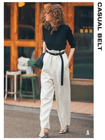 「コンパクトな黒のトップスに、ルーズなシルエットのハイウエストパンツ。トップスをINして余ったウエストをベルトでキュッと絞る。それだけでスタイルUPも脚線カバーもできて、バランスのいい仕上がりに。ベルトはきちんと巻かず、フランクに巻くと抜けが出て力みのないモノトーンに」(樋口さん)