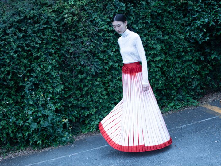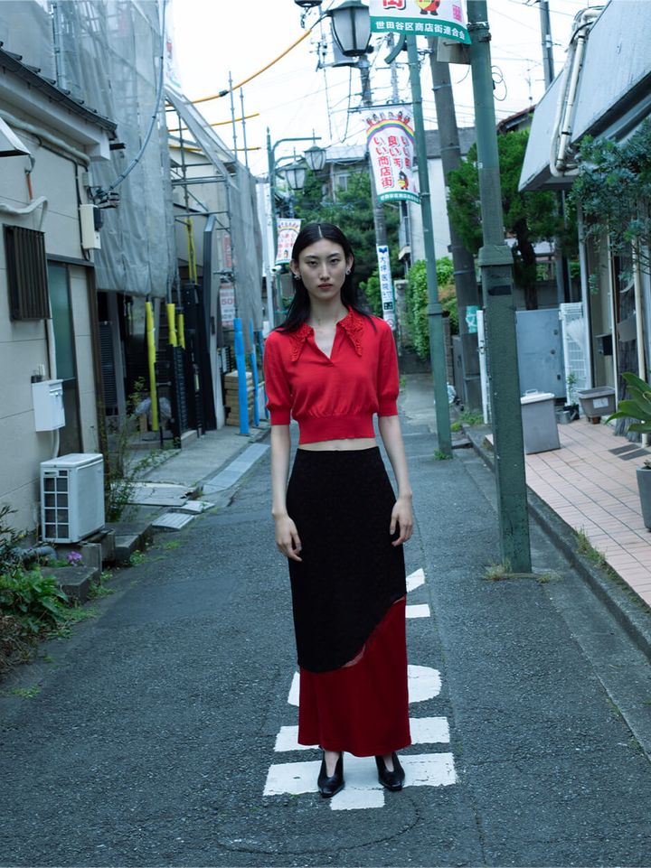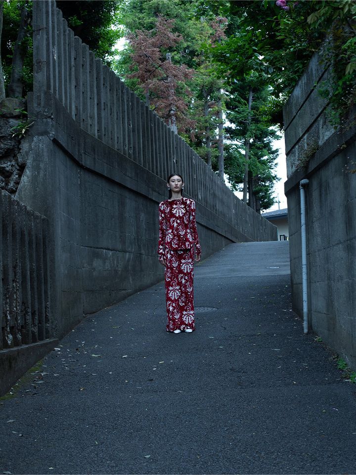 また、伝統漆器にインスパイアされた朱は、ベロア調のジャージーや板締め絞りによるスカート、ウールジョーゼットなどのさまざまなテクスチャーを染め上げ、本シリーズにリズムを与えている。